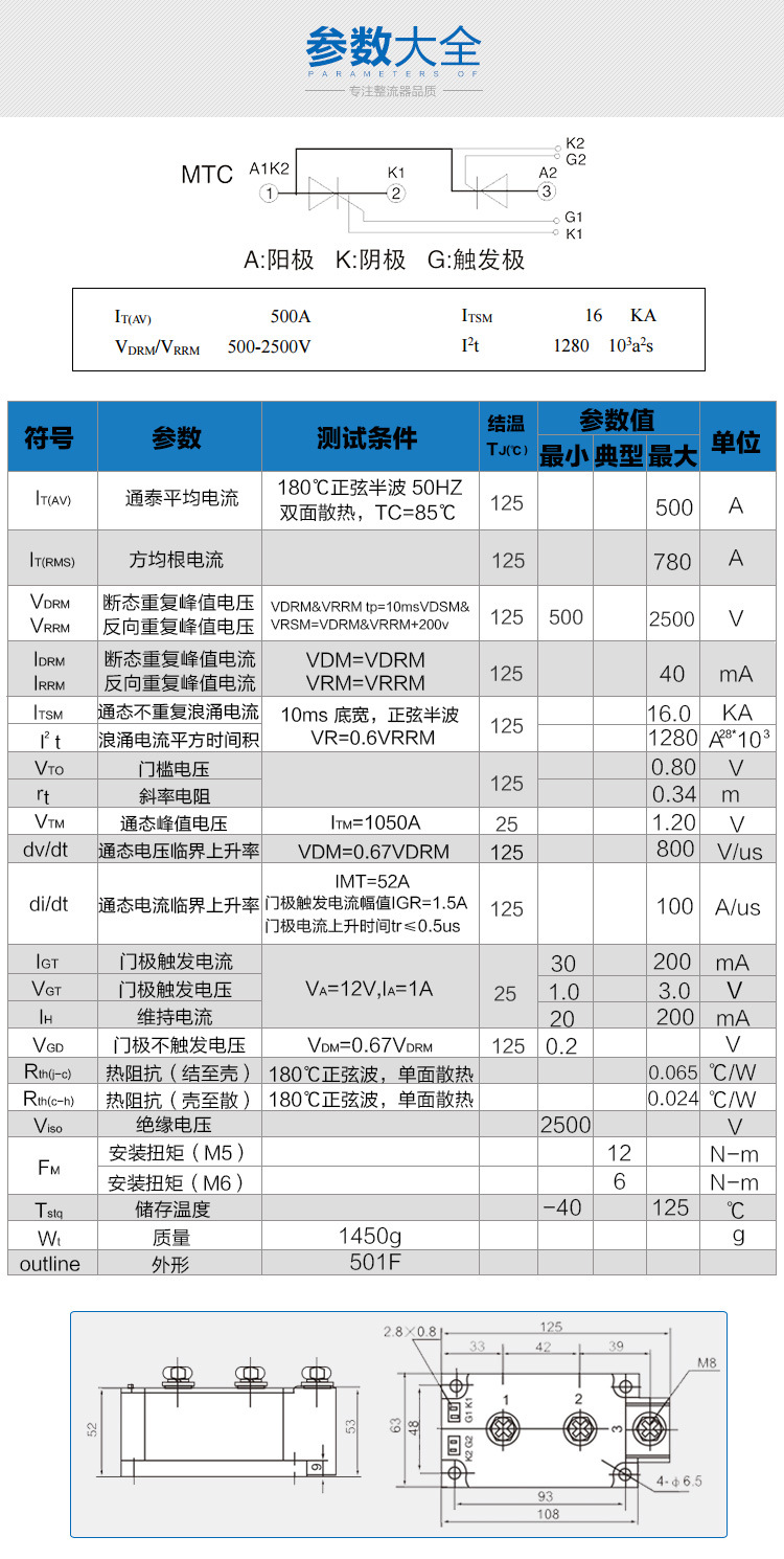 3、可控硅模塊,又名全控模塊。國內(nèi)型號:MTC,日本三社型號PK,西門康公司型號:SKKT,其電流從:25-1000A,電壓:600-3000V。其中200A以上有分風冷和水冷兩種形式,水冷的即底板上有兩個通水管。